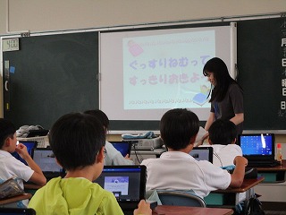 保健指導を行う予定です。今日は5年生が早寝・早起き・朝ごはんについて学習しました。養護教諭と栄養教諭の2人がそれぞれの立場で、早寝早起き朝ごはんによる体への効果を話していきました。わかってはいるけどなかなか早く寝ていない、ぎりぎりまで寝ている等、それぞれが自分の生活リズムを見直すきっかけになることを期待しています。