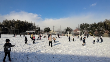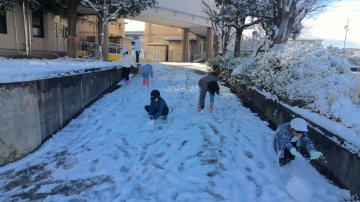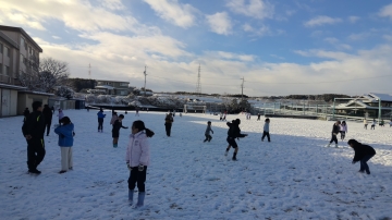 今シーズン初めての積雪。子どもたちは運動場で雪遊びを楽しんでいました。今日の雪はサラサラしていて丸めにくいようで、「全然固まらん」と雪玉を作りながら話している子もいました。25分休みには運動場の雪も解けていきました。