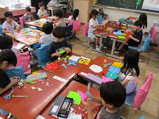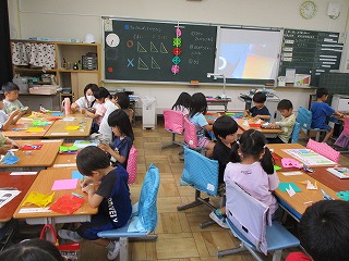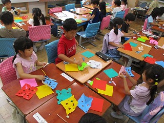 1年生が図工で「ちょっきんぱでかざろう」をテーマに「かざりづくり」に取り組んでいました。色紙を三角や四角に折り、ハサミでチョキチョキ切っていきます。広げてみると素敵な模様の色紙が何枚も出来上がっていきました。色紙をのりで貼り付け、完成です。