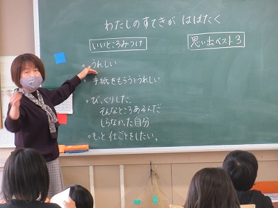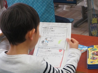 友達から教えてもらった「自分のいいところ」を読んで、思ったことや感じたことを出し合いました。友達から「いいところ」