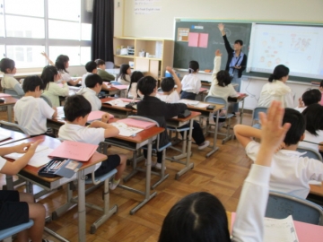 3年生になって外国語活動の時間が始まりました。この学習のねらいは「聞く話す活動を通して、英語に慣れ親しむ」ことにあります。今日の学習は、各国の子どもたちが英語で自分の国のあいさつを紹介する動画を見て、どの国のあいさつかを考えるものでした。「早いでわからへん」「なんて・・・なんて・・・」等、一生懸命に聞いているのですが、なかなか聞き取ることが難しいようでした。これから少しずつ慣れていき、外国語の活動を楽しんでください。