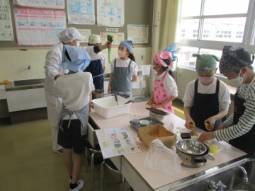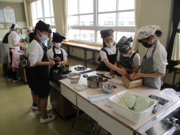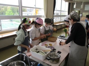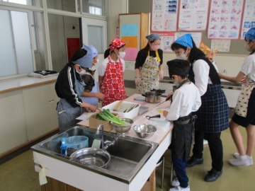 年生が調理実習で「青菜のおひたしとゆでいも」作りに取り組んでいました。ジャガイモの皮をむく子、お湯を沸かして青菜を茹でる子等、班の中で役割を分担しながら調理していました。