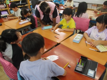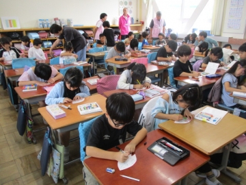 2年生が「さくらもり」さんのお話を聞きました。「さくらもり」とは川島地区の千本桜を守り育ててくれている団体です。今日は7名のさくらもりさんが来てくださいました。桜を植える経緯や桜の木の守り方などのお話しをしてくださいました。その後、教室でさくらもりさんへのメッセージや桜の木ㇸの思いを花びら型のカードに書きました。4月の桜まつりで掲示していただくそうです。「さくらさん、長生きしてね」や「さくらもりさん、さくらをまもってくれてありがとう」「大切なさくらをまもりたいです」など思いを込めて書いていました。川島地区の桜並木には地区の方々の思いが詰まっていることを感じたようです。