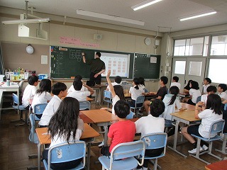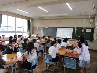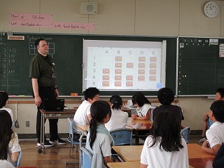 5年生がHEFのニール先生とTyhoon gameを楽しんでいました。ニール先生の問いに対して班で一人ずつ答えていきます。答えた後にカードを選び、そこに表されている得点が自分たちの班のポイントとなるものでした。今日は何月何日、好きな教科やスポーツ等、いろいろな問いがありましたが、すべて答えがでていました。