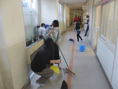 明日の卒業式に向けて、5年生と先生方で会場の体育館を飾り付けたり、卒業生や保護者の通り道や控室をきれいに掃除したり
