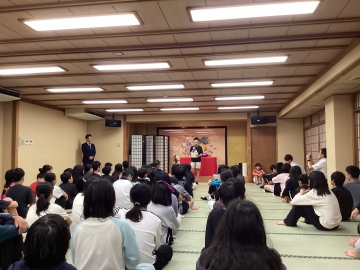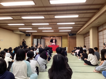 大広間で落語を聞いています。林家染八さんのつかみの話に子どもたちは大爆笑です。
