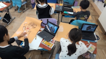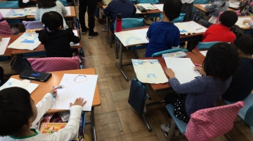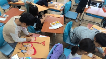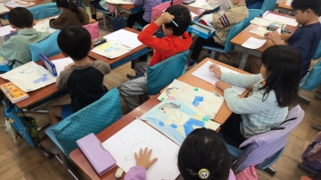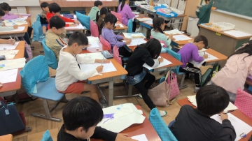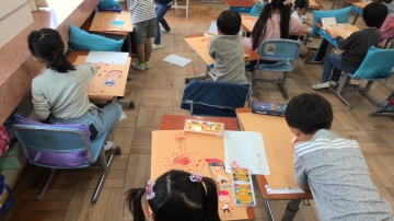 1,2年生が運動会の一場面を絵にあらわしていました。思い思いの一場面をクレパスや絵の具で描いていきました。走っているところよりも団体競技や表現運動の場面を絵にする子どもたちが多いようでした。