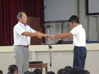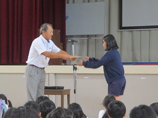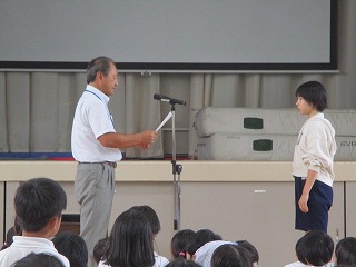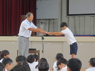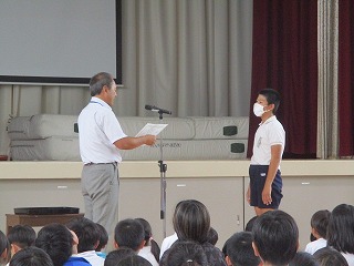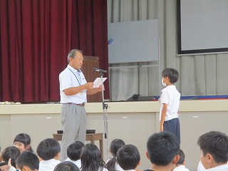 5限目、体育館にて学校集会を行いました。夏休み中に取り組んだ自由研究や読書感想文の表彰と後期の委員会や学級委員等の認証を行いました。代表で賞状や認証状を受けとった6年生の態度は素晴らしいものでした。各委員の子たちは責任をもって仕事に取り組んでくれることと思います。