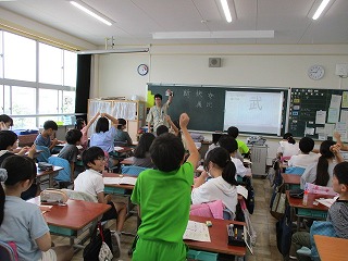 筆順をみんなで確かめ合っている場面でした。