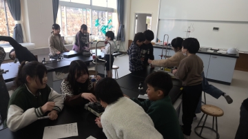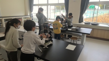 4年生の理科の実験の様子です。今日の実験は「水のあたたまり方」について調べるものでした。写真は水を温める前の準備の様子です。「もっと上」「ちょっと上げすぎかも」等フラスコを横から見て、温度計がフラスコの底につかないように高さを調節していました。