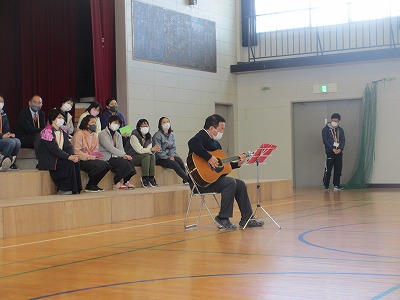 昨日、3回の「送る会」がありました。それぞれで6年生に向けた「校長先生の話」をしていたので、今日はギターの弾き語りをプレゼントしました。