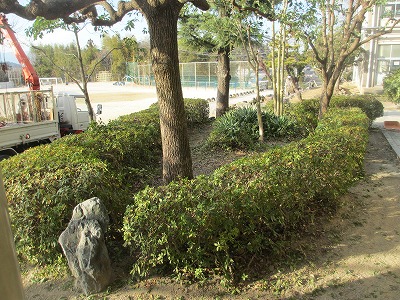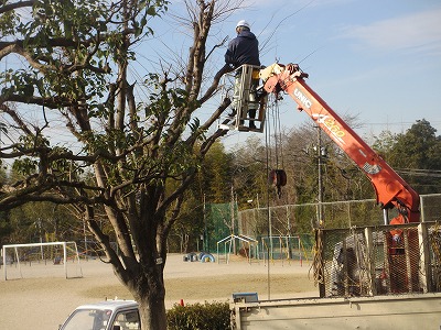 今日も樹木剪定をしていただきました。今日は、運動場の西側の遊具周辺の樹木や玄関前の樹木の選定をしていただきました。