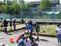5年生が総合的な学習の時間に、バケツ稲づくりに取り組みました。乾いた田んぼの土をバケツに入れ、それに水を加えて、苗を植えました。みんな泥んこになりながらも、土の感触を楽しんでいるようでした。今後は班で協力して育てていくことになります。