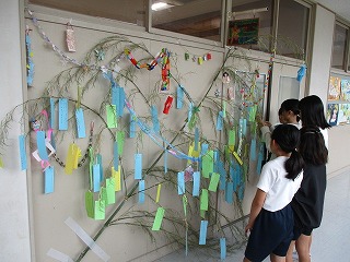 今日は雨のため運動場で遊べず、たくさんの子どもたちが20分休みに図書室を訪れていました。思い思いの本を手に取り、読書をする姿がありました。廊下に飾ってある笹の葉にも、あっという間にたくさんの短冊が飾られていきました。
