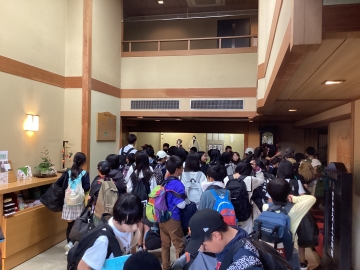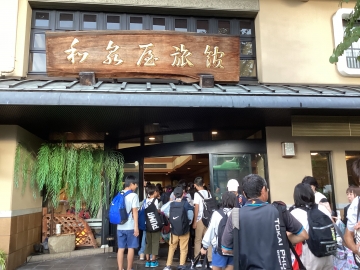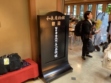 お世話になる和泉屋旅館に到着しました。夕食までの間、部屋で休憩です。朝早くからたくさん歩いたので疲れていたのでしょう、予定よりも早く旅館に着くことがわかると「やった」と声が聞こえてきました。
