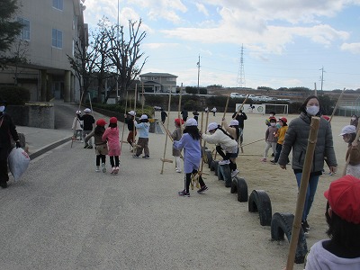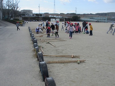 1年生が竹馬を取りに行きました。「始まる」と思い見ていると、子どもたちは教室に戻っていきました。はじまりではなく、終わり