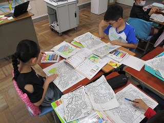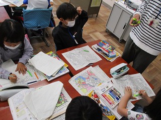 3年生は社会で川島地区のことをより知るために校区探検を行っています。これまでにも校区の何か所かに出かけています。今日はこれまでに出かけて調べてきた校区の様子を地図に書き込んでいました。「ここは田んぼだった」「ここらへんは住宅」と地図を見て色を塗りながら友だちと確かめ合っていました。