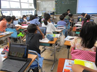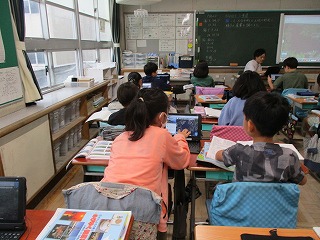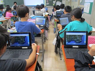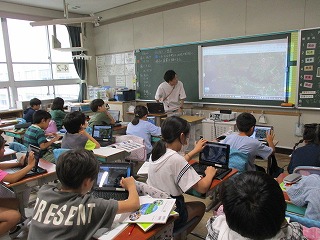 4年生が社会科で三重県の市町の様子について学習していまします。教室に入ったときは「志摩市」についての場面でした。子どもたちが航空写真を拡大していくと、海岸線の様子や養殖のいかだの様子までもがはっきりと分かりました。このような