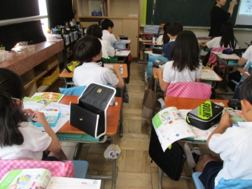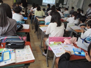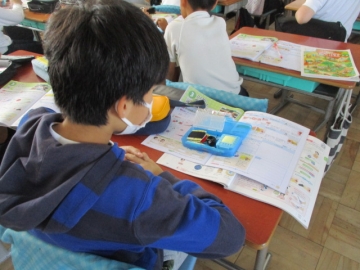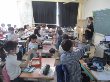 5年生の今日の家庭科の学習は「裁縫道具」の名称や使い方についての時間でした。綺麗に整理されているたくさんの針、感触のいい針刺し、角度がついたハサミ等、いろいろな種類の道具を手に取り確かめていました。実際に活用するのを楽しみにしているようでした。