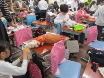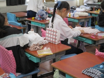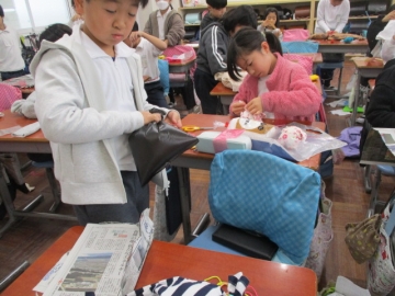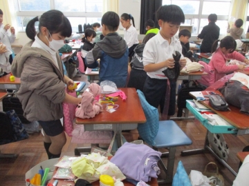 3年生の図工では「生まれかわったなかまたち」という題材に取り組んでいます。布等の残りや袋をベースにして人形(なかま)を作っていました。それぞれが自分のイメージするなかまを作りあげ、友だちと見せ合っていました。