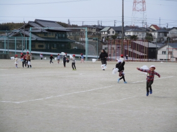 1年生みんなが運動場を走り回って、たこあげを楽しんでいました。