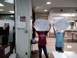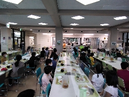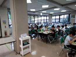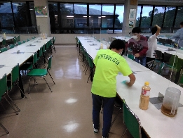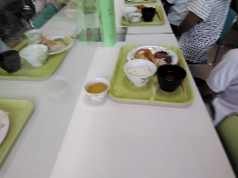 食事の時間となりました。食事係の指示に従い、検温、消毒を済ませたあと、自分で受け取り、テーブルにつきました。