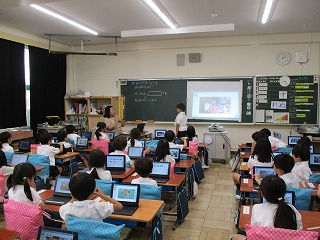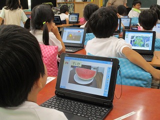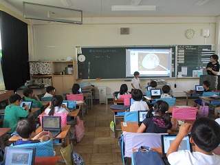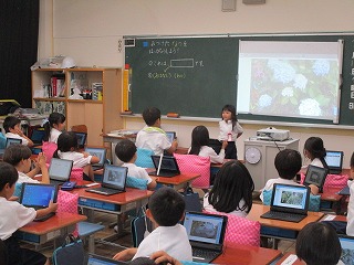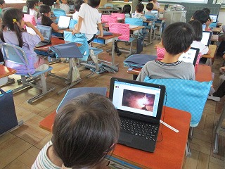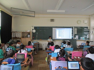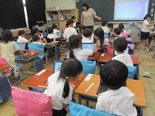 1年生が生活科で、それぞれが夏をイメージして撮ってきた写真を紹介し合っていました。「これは〇〇です。」と自分で撮ってきた写真を見せ、その後に簡単な説明をしていました。自分の写真を早く紹介したい子どもたち、自分の順番が来ると嬉しそうに話していました。