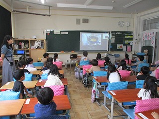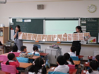 1年生が食育として「きゅうしょくしつのひみつ」という学習をしました。1組、2組とも1時間ずつ、栄養教諭の市岡先生と担任の先生で授業を行いました。
