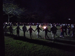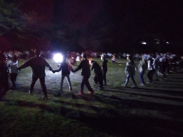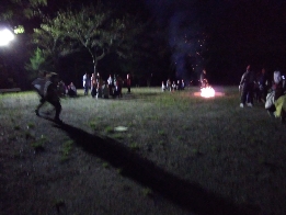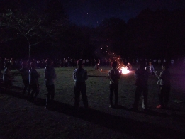 キャンプファイヤーで盛り上がっています。火を迎える集いで、誓いの言葉を代表の児童が言ったあと、ジンギスカンを踊ったり、猛獣狩りゲームをしたり、マイムマイムを踊ったりしています。思い出に残る夜になりそうです。
