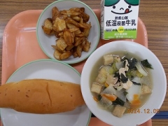 小型玄米パン 牛乳 ちゃんこ鍋 里いもとごぼうのあげがらめ