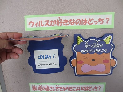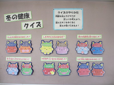 保健室前の掲示板が新しくなりました。内容は「冬の健康クイズ」です。問題を見て、正解が書かれていると思った方のオニを