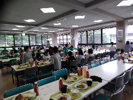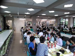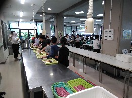 現在は夕食の時間です。食事係さんの話の後、みんなで大きな声で「いただきます」をしました。班で楽しそうに食べています。