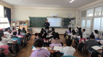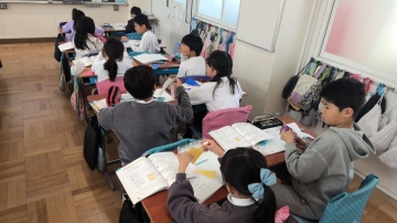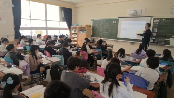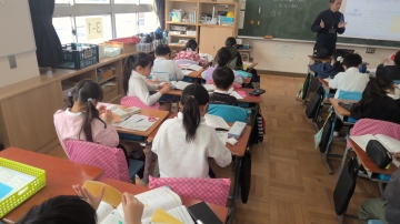 3年生の算数では「三角形を調べよう」と、半分に折った折り紙をハサミで切って自分で三角形を作るところから学習が始まりました。子どもたちが「二等辺三角形ができた」「私は正三角形ができたよ」等、自分の作った三角形を発表すると、教師からは「なぜ〇〇三角形と思ったのか」という問い返しがあり、子どもたちはその理由を考え合っていました。