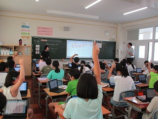 2学期最初のニール先生と谷先生の外国語の学習が今日から始まりました。今日の学習のがゴールは「できることできないことを伝える」でした。自分のできることだけでなく、友だちのできることを伝えることにも取り組んでいました。