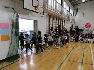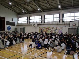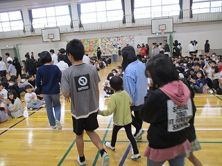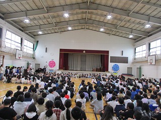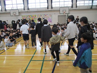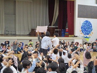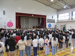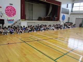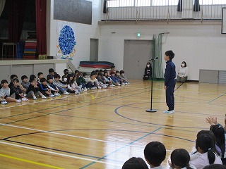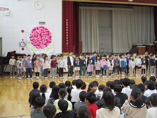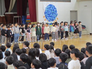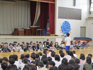認証式後、1年生を迎える会を行いました。「1年生を歓迎して、みんながなかよくなるきっかけとする」ことがこの会のねらいです。6年生と手をつなぎ入場してくる1年生たちを全校児童が拍手で迎えました。児童会委員のあいさつ、合唱、クイズと