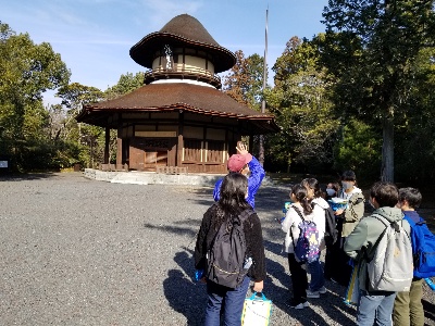 松尾芭蕉の生誕300年を記念して1942年に建てられた建造物です。形は、芭蕉の旅姿を建築に表そうとしたそうです。