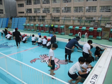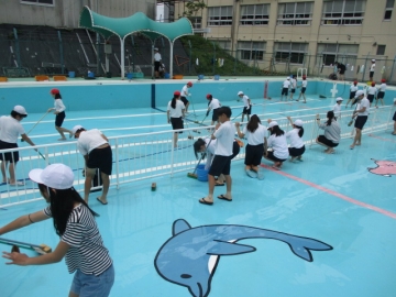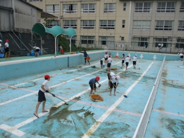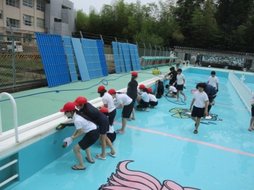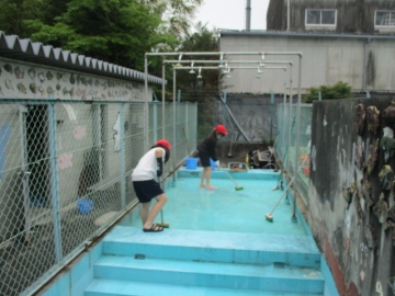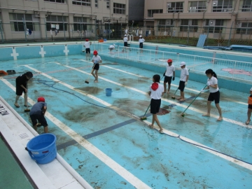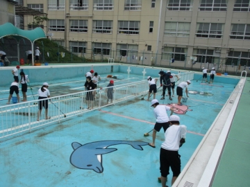 プール掃除を行いました。9日から始まる水泳の学習に向けた準備です。