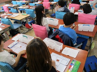 授業の始めはピカピカのパレットと絵の具を机の上に置いて、先生の話をしっかりと聞いていました。その後、水を準備し準備完了です。