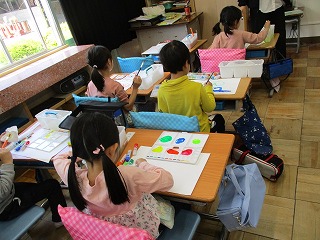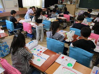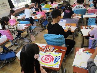 6色の絵の具を使って思い思いに線や模様を描いていました。