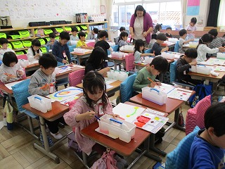 「すいすいぐるーり」今日の1年生の図工のテーマです。今日は1年生が入学してから初めて絵の具を使って絵を描いていました。