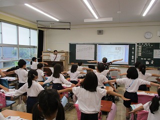 2年生の音楽で、ドレミのうたに合わせて体操を楽しんでいました。子どもたちは各音階ごと決められたポースを取り体で表現していました。音階ごとのポーズを覚えてくると、だんだんと一つ一つのポーズも大きくなり楽しく学習していました。
