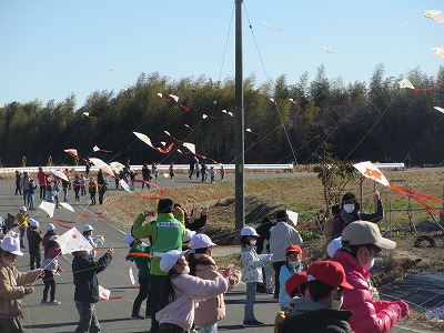 みんなの凧ができあがったら、土地改良区の道路まで凧あげに行きました。歩いているときから、ワクワクでした。