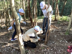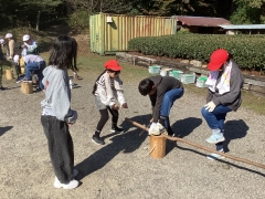 里山保全活動が始まりました。森の中で木を切り、広場にて薪づくりを頑張っています。