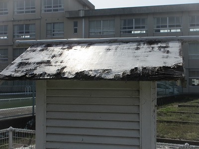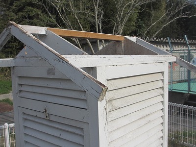明日、校長が教員生活を卒業します。卒業制作として「百葉箱」の屋根を作りました。屋根が朽ち果て、扉の蝶番も壊れていました。