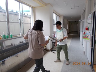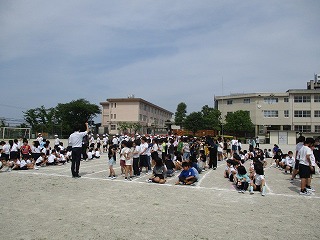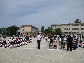 本日、不審者対応訓練を行いました。教諭一人が不審者役となり、1年生の教室に侵入したとの想定で行いました。全校児童が教頭先生の放送の指示をよく聞き、素早く運動場に避難することができました。