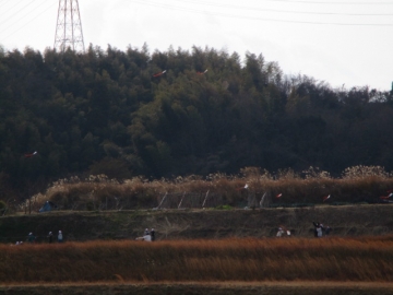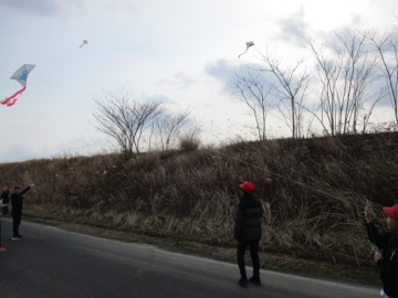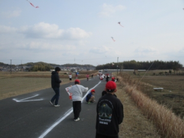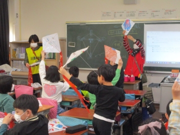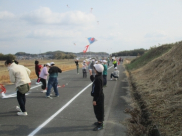 各教室で凧作りをした後、学校南側の土地改良区へ移動し凧あげを楽しみました。「揚がった、揚がった」「めっちゃ楽しい」等、子どもたちからは声が上がっていました。