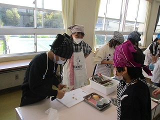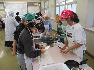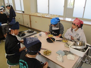 6年生が調理実習で「ジャーマンポテト作り」に取り組んでいました。前のホワイトボードには、「包丁を使ってジャガイモの皮むきにチャレンジ」と書いてありました。包丁を使っている場面では、友だちの作業を心配そうにのぞき込む姿がたくさんありました。