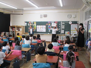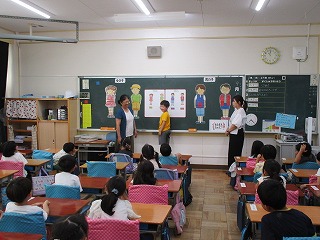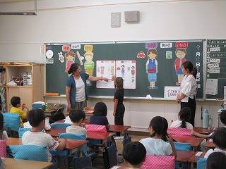 人権擁護委員さん3人にお越しいただき、ジェンダーをテーマにお話しいただきました。黒板に4人の登場人物を紹介し、その持ち物や職業について考えました。