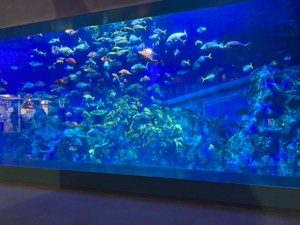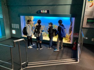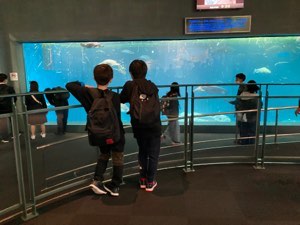 現在、鳥羽水族館です。班でそれぞれ好きなコーナーを見学しています。