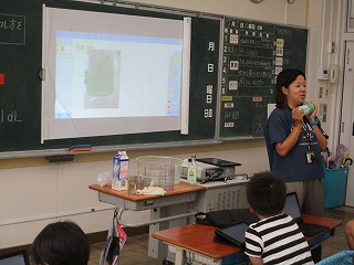 2年生が算数で「水のかさ」について学習しています。ペットボトル、牛乳パック等を活用して、水のかさを表す単位について学んでいます。子どもたちは普段それほど意識することはないようですが「そういえば見たことある」等、自分の生活を振り返っていました。